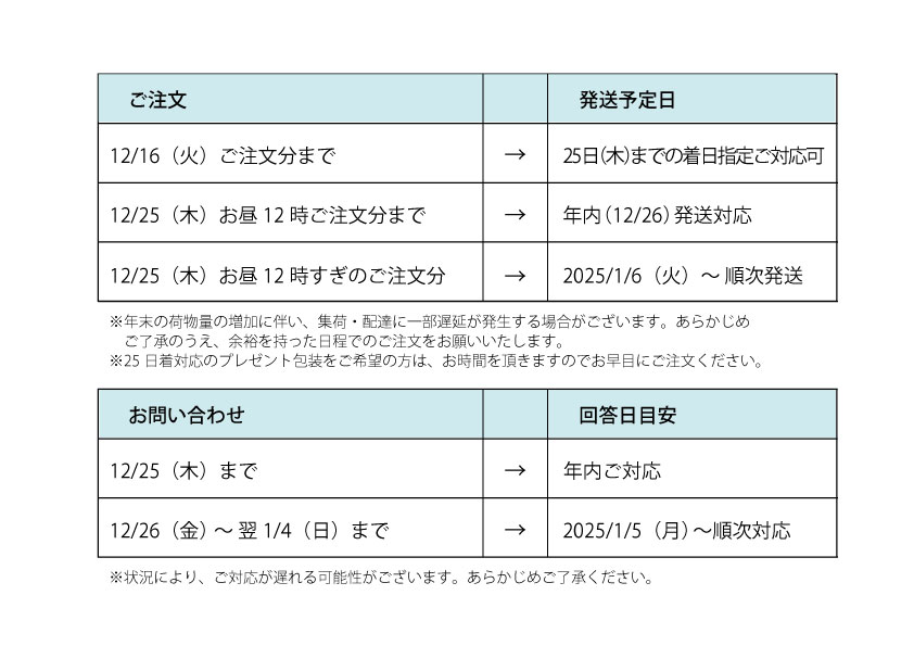 休暇に伴い、オンラインショップにて2025年12月25日(木)お昼12時までにいただいたご注文分は年内発送対応となります。