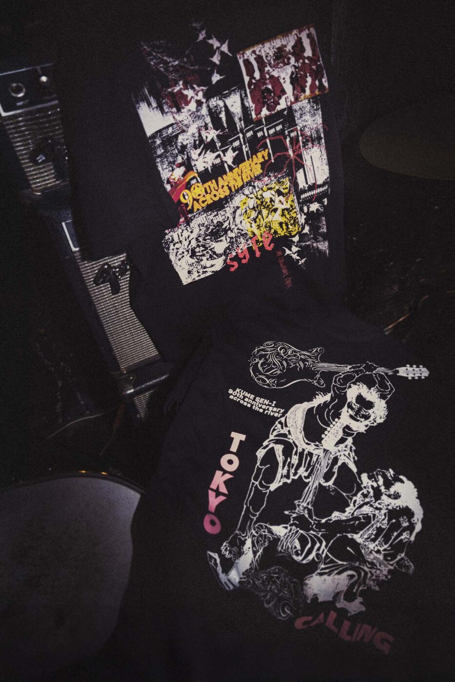 本コレクションでは、久米繊維で人気の高い北斎プロジェクトにS’YTEのエッセンスが一体化したTシャツを2型展開。葛飾北斎の傑作群の中に娘の葛飾応為の作品を盛り込み、ロックアルバムのカバーアート風に落とし込まれたデザインや、『忠義水滸伝画本』の一場面にカリグラフィーで描かれたギターが時空を超えて融合したデザインが登場します。